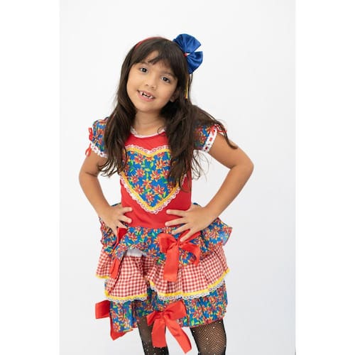 A saia rodada em camadas é composta por tecido vermelho quadriculado e estampas floridas, adicionando um toque vibrante ao visual. Além disso, o vestido é adornado com lindos laços em cetim, fixos pelo vestido.
