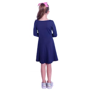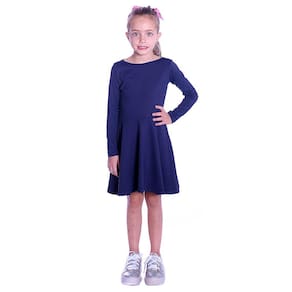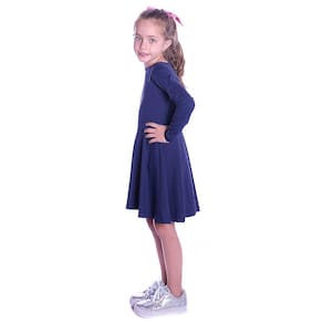 Vestido infantil manga longa no decote canoa, azul marinho, cor clássica, em tecido LIGHT CO2 biodegradável (fio AMNI SOUL ECO, o primeiro fio de nylon biodegradável do mundo), com fator de proteção solar 50FPS+ UVA e UVB.