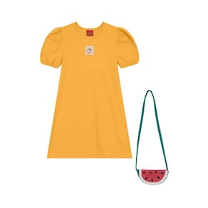 Deixe sua pequena ainda mais encantadora com o vestido infantil da Turma da Mônica. Confeccionado em cotton, possui mangas curtas bufantes e gola redonda, além de pregas na cintura que garantem um efeito rodado super fofo. Para completar, vem com uma bolsa em moletinho de melancia, perfeita para os passeios. Aposte nesse look divertido e confortável, ideal para brincar e se divertir com estilo.