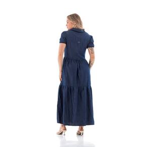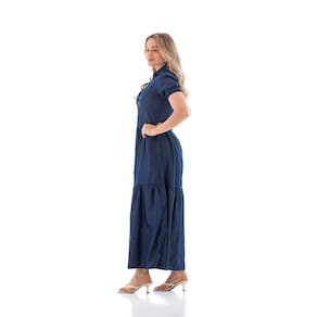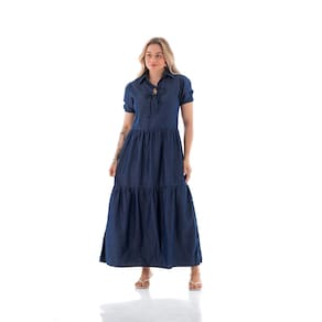 Vestido longo em jeans leve, com modelagem soltinha que garante conforto e movimento. Possui decote com amarração, gola clássica e mangas curtas com leve volume, trazendo um toque moderno e delicado. A saia em camadas cria um caimento fluido e sofisticado, ideal para o dia a dia ou produções casuais mais arrumadas. Uma peça prática, versátil e atemporal para acompanhar você em todas as ocasiões.
