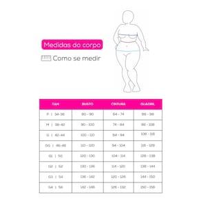 Medidas da Modelo: Altura: 160cm, Cintura: 71cm, Quadril: 99cm, Busto: 90cm