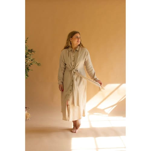Vestido KALALOU de manga comprida com botões e gravata frontal - Aveia