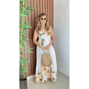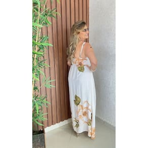 Este é um vestido longo de alças finas com estampa floral, ideal para estações quentes como a primavera e o verão. Ele apresenta um fundo branco com grandes flores e folhagens em tons de laranja e verde, distribuídas por toda a peça. O decote em V possui um detalhe de amarração no centro do busto. A modelagem é fluida e acinturada, valorizando a silhueta, e o caimento da saia é solto, com um babado na barra que dá movimento. A peça é descrita como versátil e cheia de charme, combinando romantismo e sofisticação. Marca: Não Informado