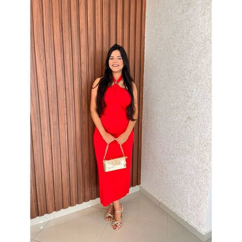 O vestido é de comprimento midi, terminando logo abaixo dos joelhos. Ele apresenta um design frente única, com alças que se prendem atrás do pescoço, deixando os ombros e parte superior das costas em evidência. A modelagem é ajustada na parte superior e na cintura, com um elegante drapeado na cintura que valoriza a silhueta. O caimento é fluido após a cintura, descendo suavemente até a bainha. O tecido leve, como malha com elastano, o que contribui para o movimento e ajuste confortável da peça. Marca: Não Informado