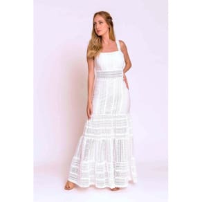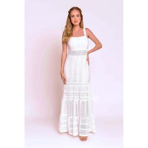 Vestido Longo Renda Guipir, possui zíper de fecho nas costas, alça larga em renda guipir e detalhes vazados em renda guipir ao longo de todo o comprimento da peça. Este vestido tem um caimento que traz um diferencial ao look. É uma peça sofisticada por conta dos seus detalhes em renda guipir. Código do Produto: T0787