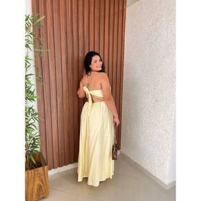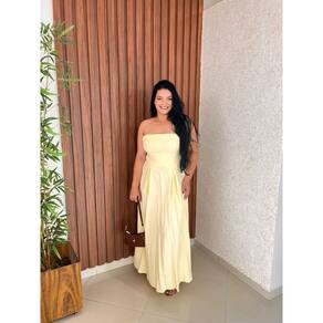 O vestido é um modelo longo, com comprimento que vai até os pés. Ele possui um design tomara que caia, valorizando a região do colo e dos ombros. O busto é ajustado e, na cintura, o corte império alonga a silhueta, de onde a saia começa a descer. A saia tem uma modelagem evasê, rodada e fluida, com pregas fêmeas na parte frontal que criam um volume gracioso e movimento a cada passo. Marca: Não Informado