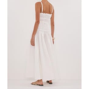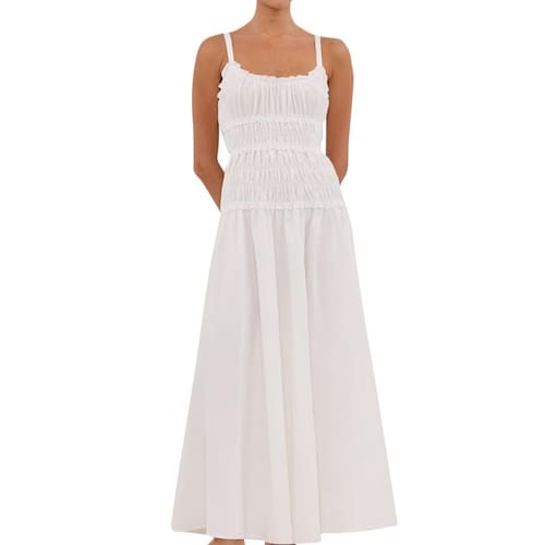 - Estilo: Vestido longo rodado Aline com alças finas, vestido rodado com acabamento de babados, bem estilizado com colar, brincos, saltos altos e clutches ou mantenha casual com chinelos e óculos de sol grandes.