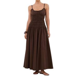 Eahusar Vestido maxi feminino com alças finas, sem mangas, gola redonda, babados, elástico, casual, boêmio, rodado, Marrom, P
