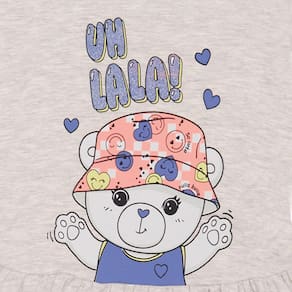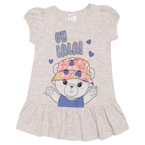 Sua filha vai ficar uma fofura com esse Vestidinho Pulla Bulla, confeccionado em Meia malha na cor Mescla banana com uma estampa super fofa de ursinha com detalhes em glitter, um Look perfeito para qualquer hora, cheio de chame e conforto. Uma peça indispensável no guarda-roupas da sua filha.\n