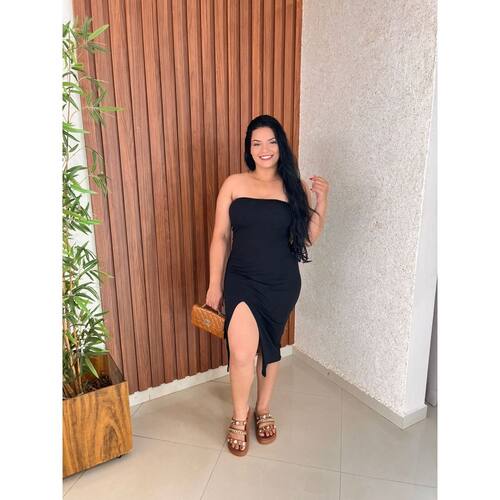 O vestido é um modelo midi, que se estende aproximadamente até a altura da canela. Possui uma modelagem tubinho, que se ajusta perfeitamente ao corpo, realçando a silhueta. A peça é tomara que caia, deixando os ombros e o colo em evidência, e conta com uma fenda lateral na perna, que adiciona um toque de estilo e facilita o movimento. O tecido, canelado oferece elasticidade e conforto. Marca: Não Informado