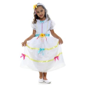 O vestido é ricamente decorado com fitas e laços em cetim, adicionando um charme especial à cintura. E como destaque, uma fita de cetim com uma linda flor de girassol no meio, simbolizando o espírito alegre e vibrante das festas juninas.