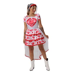 Em seu busto possui uma linda estampa de coração, suas mangas são bufantes com elasticos e desenhos de varios coraçôes. Descendo para a saia, ela contém camadas e babados na cor vermelha e coraçoes em toda a parte da saia e, além disso tudo, o vestido acompanha uma linda cauda longa branca. Tornando esse o vestido junino perfeito para a sua festa. O vestido de noiva acompanha uma tiara com um véu tule e corações colados em sua superfície. Confira!