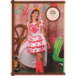 Luxuoso vestido de noiva caipira, confeccionado em material de qualidade que trás muito mais conforto na hora do uso, essa fantasia de noiva é na cor branca mas com detalhes vermelho.