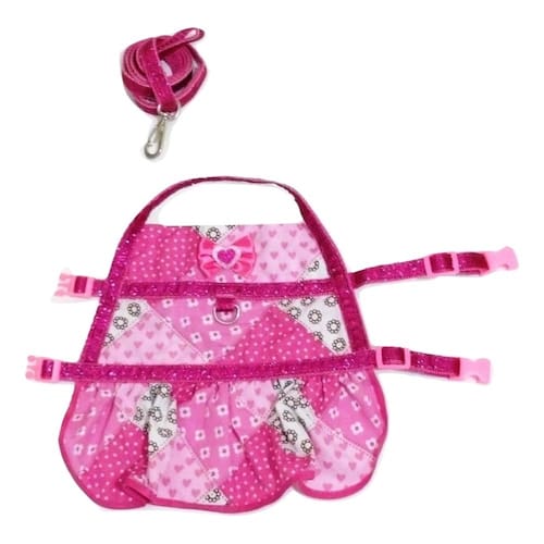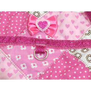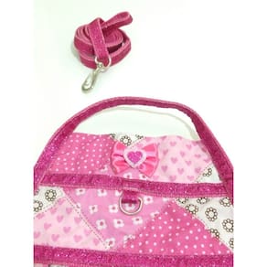 Tecido tricoline ou textoleen estampado na cor rosa ; Acabamento em viés rosa; Regulagem, fita de nylon com glitter rosa com presilhas de plastico; Laço na cor do vestido; Tamanho: P; Medidas aproximadas: 31 cm a 38 cm de circunferência abdominal, 30 cm de circunferência do pescoço, 22 cm de comprimento.