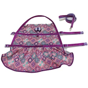 Tecido tricoline ou textoleen estampado na cor roxa ; Acabamento em viés roxa; Regulagem, fita de nylon com glitter roxo com presilhas de plastico; Laço na cor do vestido; Tamanho: GG Medidas aproximadas: 50 cm a 60 cm de circunferência abdominal, 48 cm de circunferência do pescoço, 36 cm de comprimento.