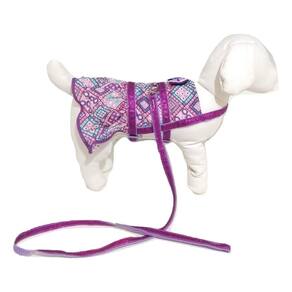 Tecido tricoline ou textoleen estampado na cor roxa ; Acabamento em viés roxa; Regulagem, fita de nylon com glitter roxo com presilhas de plastico; Laço na cor do vestido; Tamanho: GG Medidas aproximadas: 50 cm a 60 cm de circunferência abdominal, 48 cm de circunferência do pescoço, 36 cm de comprimento.