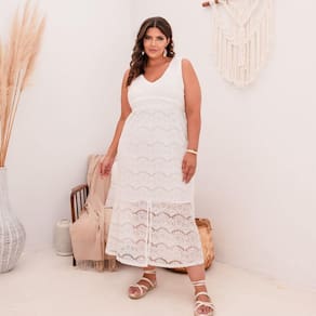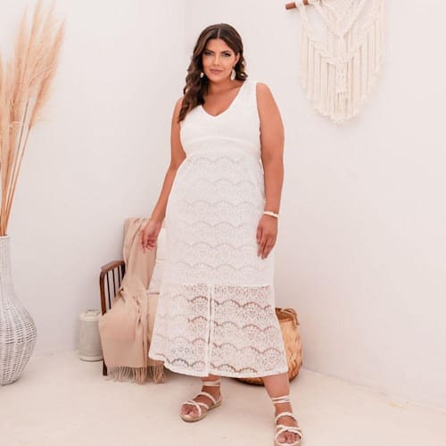 O design regata com decote em V é atemporal e favorecedor, enquanto o zíper nas costas adiciona um toque prático à peça. O acabamento rendado na barra completa o look com charme romântico e elegância, proporcionando um movimento suave e fluído.Este vestido plus size é perfeito para ocasiões especiais, festas ou eventos que exigem um toque extra de glamour. Com sua combinação de renda desenhada, detalhes delicados e conforto incomparável, este vestido é uma escolha certa para a mulher que deseja brilhar com confiança e estilo.
