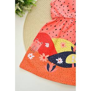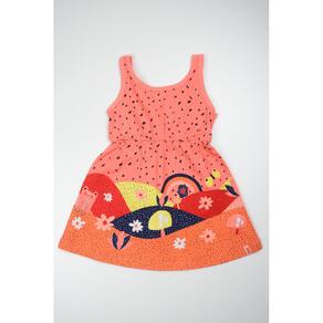 Este vestido, em um adorável tom coral, é adornado com uma estampa única de flores e insetos de jardim, celebrando a natureza de forma delicada e encantadora. Feito com o mais suave algodão, proporciona o conforto necessário para os dias cheios de aventuras das pequenas.