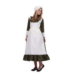Emeline Colonial Camponês Olive Zíper, Vestido de manga comprida com anexado fora avental branco, gorro.- 81366-G