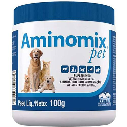 Vetnil Aminomix Pet 100 g- Indicamos mistura-lo junto com a ração do seu Pet;- Indicado na suplementação de cães, gatos e mustelídeos, para melhora da qualidade nutricional dos alimentos. Auxilia no preparo para exposições e competições, no ganho de performance atlética e nas fases críticas da criação (crescimento, gestação, lactação e geriatria);