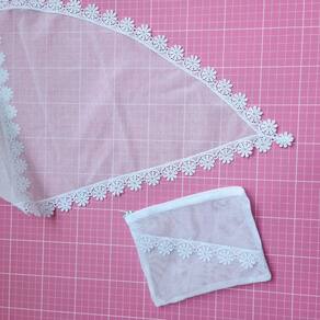 Confeccionado Tule Poá (100 poliéster) e Renda Guipir (100% poliéster).