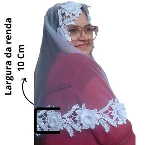 Confeccionado com Tule Francês Transparente (100%poliéster) e Renda Guipir (100% poliéster).