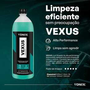 Descrição: Vexus é um limpador de alta performance, desenvolvido especialmente para limpeza de rodas e motores. O produto age na remoção da sujeira sem agredir as rodas e as partes do motor, seja plástico, pintura, borracha ou metal.