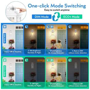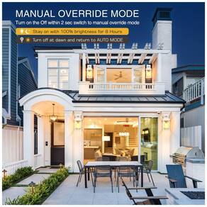 Modo de substituição manual exclusivo estas lanternas externas para varanda frontal podem estar continuamente com 100 de brilho à noite, como cenas de festa. Para mudar para o modo manual de um automático e ligar o interruptor de parede com 0,5 2 segundos ... Neste modo, a luminária externa liga e mantém 100 de brilho por aproximadamente 8 horas, mas desliga automaticamente Alvorecer.