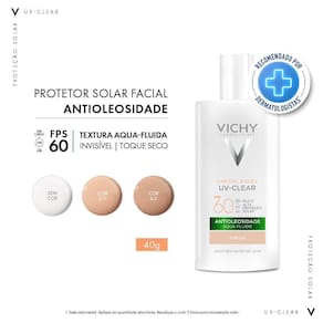 Vichy capital soleil uv-clear 2.0 fps 60 40g Resultado: Fotoproteção diária avançada contra os raios uva, uva longo e uvb Textura aquafluida com acabamento invisível para todos os fototipos Absorção rápida e acabamento matte 12h de controle de antioleosidade Redução de 40% da oleosidade da pele com apenas 8 semanas de uso Eficácia clinicamente comprovada Sugestões de uso: protetor solar facial de uso diário com ação antioleosidade e textura aqua-fluida. Itens inclusos:1 protetor solar facial vichy capital soleil uv-clear 2.0 fps 60 40g