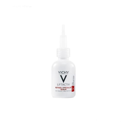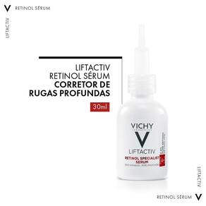 O Vichy Liftactiv Retinol Specialist Sérum Facial Antirrugas 30ml é um poderoso tratamento antirrugas que contém 0,2% de retinol puro, enriquecido com frações probióticas, peptídeos anti-idade e água vulcânica de Vichy. Com eficácia comprovada contra os sinais do envelhecimento, este sérum corrige todos os tipos de rugas, inclusive as mais profundas, uniformiza a textura da pele e auxilia na renovação celular.