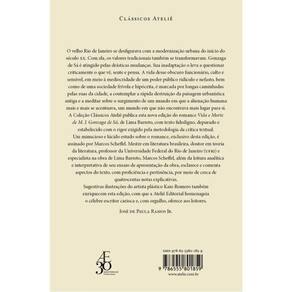 O velho Rio de Janeiro se desfigurava com a modernização urbana do início do século XX. Com ela, os valores tradicionais também se transformavam. Gonzaga de Sá é atingido pelas drásticas mudanças. Sua inadaptação o leva a questionar criticamente o que vê, sente e pensa. A vida desse obscuro funcionário, culto e sensível, em meio à mediocridade de um poder público ridículo e nefasto, bem como de uma sociedade frívola e hipócrita, é marcada por longas caminhadas pelas ruas da cidade, a contemplar a rápida destruição da paisagem urbanística antiga e a meditar sobre o surgimento de um mundo em que a alienação humana mais e mais se acentuava, um mundo em que não encontrava mais lugar para si. A Coleção Clássicos Ateliê publica esta nova edição do romance Vida e Morte de M. J. Gonzaga de Sá, de Lima Barreto, com texto fidedigno, depurado e estabelecido com o rigor exigido pela metodologia da crítica textual. Um minucioso e lúcido estudo sobre o romance, exclusivo desta edição, é assinado por Marcos Scheffel. Mestre em literatura brasileira, doutor em teoria da literatura, professor da Universidade Federal do Rio de Janeiro (UFRJ) e especialista na obra de Lima Barreto, Marcos Scheffel, além da leitura analítica e interpretativa de seu ensaio de apresentação da obra, esclarece e comenta aspectos do texto, com proficiência e pertinência, por meio de cerca de quatrocentas notas explicativas. Sugestivas ilustrações do artista plástico Kaio Romero também enriquecem esta edição, com que a Ateliê Editorial homenageia o célebre escritor carioca e, com orgulho, oferece aos leitores. [José de Paula Ramos Jr.] Coleção Clássicos Ateliê Apresentação e Notas: Marcos Scheffel Estabelecimento de Texto: José de Paula Ramos Jr. e Marcos Scheffel Ilustrações: Kaio Romero