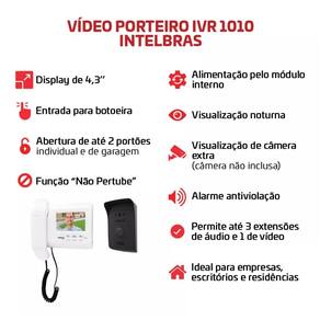 Vídeo Porteiro Intelbras IVR 1010 Branco e Preto Bivolt - Segurança e Praticidade O Vídeo Porteiro Intelbras IVR 1010 é a solução ideal para quem deseja mais segurança e controle no acesso à residência ou comércio. Com um design moderno e compacto, ele permite visualizar e se comunicar com visitantes antes de liberar a entrada. Principais Características:Monitor de 4 polegadas: Tela nítida em preto e branco para identificação clara dos visitantes.Comunicação bidirecional: Fale com quem está do lado de fora sem precisar abrir a porta.Abertura de fechaduras elétricas: Compatível com a maioria das fechaduras eletromagnéticas e elétricas.Visão noturna: A câmera embutida permite a identificação mesmo em ambientes com pouca iluminação.Bivolt automático 110V/220V : Pode ser instalado em qualquer rede elétrica sem necessidade de ajuste. Fácil instalação: Sistema de sobrepor que facilita a fixação na parede. Benefícios do Intelbras IVR 1010:Maior segurança: Controle de acesso sem precisar abrir a porta.Praticidade: Comunicação direta com o visitante sem necessidade de interfone adicional.Versatilidade: Indicado para casas, apartamentos, escritórios e estabelecimentos comerciais.Durabilidade: Fabricado com materiais resistentes e de alta qualidade.