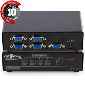 Vídeo Splitter 1x4 - Distribuidor De Sinal Vga - Kit Com 10 O Splitter VGA 1 x 4 é ideal para envio do mesmo sinal VGA simultaneamente para quatro aparelhos VGAs separados. Indicado para ampliar e espelhar para monitores, projetores e outros equipamentos com saída compatível. Tela expandida para vários monitores sem perder o sinal ou qualidade da imagem. Resolução até 19201440. Ideal para ambientes educacionais, salas de reunião e treinamento, monitoramento de sistema de segurança. Tenha suas informações de vídeo replicadas para diversos monitores com esse Splitter VGA da Cirilo Cabos. Como conectar: 1º. Conecte o seu aparelho VGA no Splitter VGA IN . 2º. Ligue os aparelhos que receberão a imagem VGA Out1 e Out2 . 3º. Conecte a fonte de energia no aparelho e na tomada de energia. Advertências: Para evitar choque elétrico, não abra o gabinete. Não exponha o produto em altas temperaturas, umidade elevada, ou luz solar direta. Antes de limpar, desligue o equipamento. Distância máxima recomendada de 30m. Conteúdo da embalagem: 01 Splitter VGA - 1 Entrada 4 Saídas 01 Fonte de energia Bivolt 01 Manual Atenção: cabos não inclusos no pacote do produto. de 3 meses. Marca: Não Informado