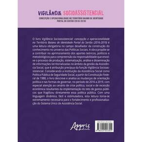 O livro Vigilância Socioassistencial: concepção e operacionalidade no Território Baiano de Identidade Portal do Sertão (2016-2019) é uma leitura obrigatória no campo desafiador da construção do conhecimento no universo das Políticas Sociais. A obra propõe-se a contribuir no aprimoramento dos aportes teóricos, políticos e metodológicos para compreensão da responsabilidade que envolve o processo de produção, sistematização, análise e disseminação de informações territorializadas no âmbito da gestão da Assistência Social, que é atribuição precípua da função Vigilância Socioassistencial. Considerando a instituição da Assistência Social como Política Pública de Seguridade Social, a partir da Constituição Federal de 1988, o livro descreve e analisa as mudanças de orientação política e nas formas de governar, no período de 2016 a 2019, com especial atenção ao cenário de crise política, social e de recessão econômica resultantes da implementação do teto de gastos públicos que fragilizou diretamente essa política pública. Com uma linguagem dinâmica, fácil e estimuladora, esta leitura torna-se extremamente necessária para o fortalecimento e profissionalização do Sistema Único de Assistência Social.