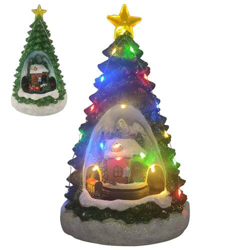 Mini Árvore de Natal com cenário Natalino Músical Iluminado com Estação de Trem possuindo 22cm.