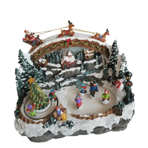 A vila decorativa de natal com patinadores é ótima opção para sobrepor um móvel, junto a árvore de natal, naquele cantinho especial ou onde seu bom gosto mandar. Perfeito para seu ambiente e as crianças, huu irão ficar deslumbradas. Movimenta-se a luz (acompanha fonte bi volt), e ao ligar, a árvore de natal gira com os personagens, assim como sobre a pista de patinação eles patinam em movimentos circulares. A iluminando colorida se dá pela frente e o poste no canto, detalhes que dão um destaque a mais em toda a peça e um charme ao seu ambiente. A base, a estrutura, os personagens e objetos são confeccionados em resina, material com maior resistência e rico em detalhes, assim como a pintura com excelente acabamento. O mecanismo contém peças plásticas. Um encanto, incrível, digno de elogios!
