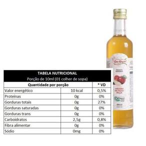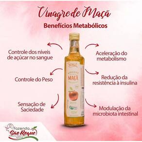 O Vinagre de Maçã é obtido a partir da fermentação do suco de maçã, possui propriedades antioxidantes, contribui para a redução de medidas, e auxilia na prevenção de doenças por ser rico em vitaminas, A fermentação da maçã através de leveduras, transforam o açúcar em álcool. O consumo de 1 colher de sopa antes do almoço e jantar, pode reduzir a quantidade de calorias que são absorvidas pelo intestino, principalmente as derivadas de pães, massas, doces e leite. O uso diário do Vinagre de Maçã contribui também para reduzir a absorção de carboidratos, reduzindo os índices de insulina, que contribuem para a prevenção do diabetes; é fonte de antioxidantes, protegendo as células e reduzindo a inflamação nas articulações, aliviando as dores; melhora a digestão dos alimentos, protegem o estômago e contribuem para melhor funcionamento do fígado. Ean: 0630941499559