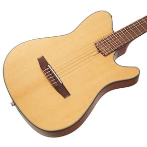 Cor do produto: Natural Flat Cor: Natural Tratamento de superfície: Cetim Tipo: FRH Corte: Sim Construção do Corpo: Semi-sólido Tampo/frente: Abeto maciço Placa traseira: Sapele Lados/ranhuras: Sapele Pescoço: Nyatoh Escala: 648mm Número de trastes: 22 Largura do nut: 46mm Nut: Osso Modelo Eletrônico: Ibanez Custom Afinador integrado: Não Tarraxa de afinação: Ibanez Gold Classical Cordas: D'Addario XTC45 Marca: Não Informado