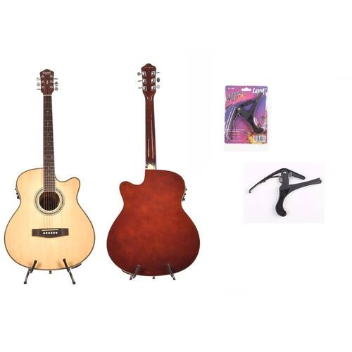 Kit Com Violão Land Elétrico Aço Natural Capo Traste Pba04 O Kit Com Violão Land Elétrico Aço Natural Capo Traste Pba04 é perfeito para músicos que buscam versatilidade e qualidade sonora. O violão elétrico lw-a-40e da linha Water Series se destaca pelo equilíbrio sonoro e ótima construção. Com encordoamento em aço, é uma excelente opção para músicos que valorizam tocabilidade. Seu braço confortável permite um bom encaixe das mãos, facilitando a execução das pestanas e acordes. Além disso, o violão possui um design anatômico e moderno, garantindo conforto durante o uso. O land lw-a-40e também oferece uma captação com maior qualidade, permitindo que você reproduza o som do violão de forma fiel. O afinador digital embutido facilita a afinação do instrumento, tanto para iniciantes quanto para músicos mais experientes. O pré equalizador land eq-klt-17a é uma ótima opção para quem busca qualidade de som e versatilidade. Com 4 bandas de equalização grave, médio, agudo , ajuste de volume e afinador cromático digital, você terá total controle sobre o som do seu violão. O pré equalizador também possui a função phase, que anula o efeito de microfonia, garantindo um som limpo e sem interferências indesejadas. O violão land lw-a-40e possui especificações técnicas que garantem um ótimo desempenho. Possui tampo e fundo em linden, escala em richlite finberboard, braço em mahogany e acabamento em verniz brilhante. Com cutway e marcação em bolinhas brancas, o violão tem um visual moderno e elegante. Comprimento de 111,0 cm, largura de 52,0 cm, espessura de 19,0 cm e peso de 4,00 kg, o violão land lw-a-40e é compacto e fácil de transportar. É ideal para ou para quem gosta de tocar em diferentes ocasiões. Além do violão, o kit também inclui o capotraste land pb-a04. Essencial para músicos de violão e guitarra, o capotraste permite uma mudança de tom na canção de forma prática e rápida. Com design moderno e ajuste confortável, o capotraste se adapta ao instrumento sem a necessidade de ajustes. Pequeno, discreto e portátil, pode ser trocado facilmente entre os trastes do instrumento. O Kit Com Violão Land Elétrico Aço Natural Capo Traste Pba04 é perfeito para músicos que valorizam qualidade sonora, versatilidade e praticidade. Adquira já o seu e tenha um instrumento musical de alta qualidade para todas as ocasiões.