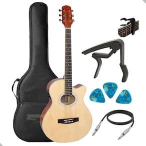 O Kit Completo Violão Eletrico acompanha além do violão, uma capa para proteção, um capotraste para facilitar a troca de afinação, três palhetas para diferentes estilos de tocar e um cabo P10xP10 de 3 metros para conectar o violão a um amplificador ou sistema de som.