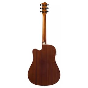 O corpo do violão segue o padrão folk com cutaway, favorecendo volume natural e acesso confortável às casas mais agudas.