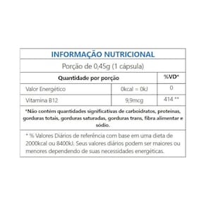 Ingredientes: Amido de milho e cianocobalamina. Cápsula: gelatina vegetariana e água.