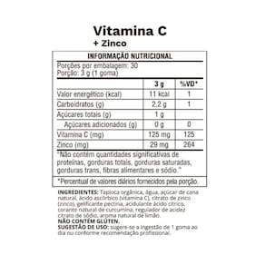 Ingredientes: vitamina c, zinco, tapioca orgânica, açúcar de cana natural, pectina, corante natural de curcumina e aroma natural de limão.Não contem glútem. Registro no ministério da saúde: produto isento de registro.