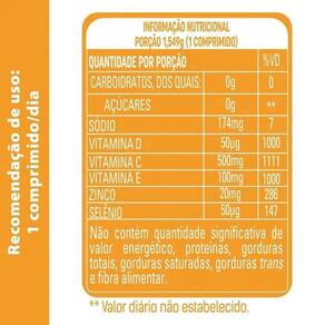 Suplemento alimentar de Vitamina D3 em comprimidos revestidos. Possui 2.000UI de Vitamina D que auxilia no funcionamento do sistema imune e muscular. Indicado como suplemento vítaminico em dietas restritivas e inadequedas. Com vitamina C, selênio e Zinco. Modo de usar: 1 comprimido ao dia ou de acordo com recomendação do médico e/ou nutricionista. Ean: 7896094919327