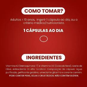 Vitamina k2 menaquinona-7 e vitamina d3 colecalciferol , azeite de oliva. Antioxidante: di alfa tocoferol. Composição da cápsula: água purificada, gelificante gelatina, umectante glicerina e corante carmim.