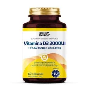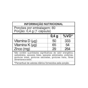 Suplemento alimentar com alto teor de Vitamina D3, K2 e Zinco, três nutrientes poderosos que auxiliam no fortalecimento do sistema imune e saúde dos ossos.