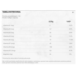 B complex é uma fórmula inteligente que oferece todas as vitaminas do complexo b - incluindo suas formas ativas -, associadas ao magnésio quelado, buscando uma sinergia perfeita entre os nutrientes e um melhor aproveitamento no organismo. as vitaminas do complexo b são muito importantes para o nosso organismo, independente da idade. Elas estão envolvidas no metabolismo energético e no funcionamento do sistema imune, entre muitas outras funções. Na fórmula do b complex você encontra as 8 vitaminas desse grupo b1, b2, b3, b5, b6, b7, b9 e b12 , com o grande diferencial de incluir suas formas ativas, associadas ao magnésio quelado. sugestão de consumo: consumir 1 cápsula ao dia, no horário de sua preferência, ou conforme orientação de médico ou nutricionista. Marca: Não Informado
