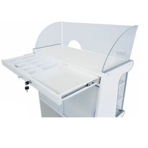 Qual o material do caixa? É fabricado em madeira (MDF) com painéis de vidro na parte frontal e nas laterais, garantindo um visual moderno e resistente.