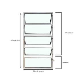 Especificações Técnicas Marca: Brecorimo Modelo: Basculante Linha Esmeralda Cor: Branco Material: Alumínio Vidro: Liso Verde 3mm Uma Seção Medidas da peça: 100 cm x 40 cm x 3 cm altura x largura x espessura