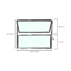 Especificações Técnicas Marca: Brecorimo Modelo: Basculante Linha Esmeralda Cor: Brilhante Material: Alumínio Vidro: Liso Verde 3mm Uma Seção Medidas da peça: 40 cm x 80 cm x 3 cm altura x largura x espessura
